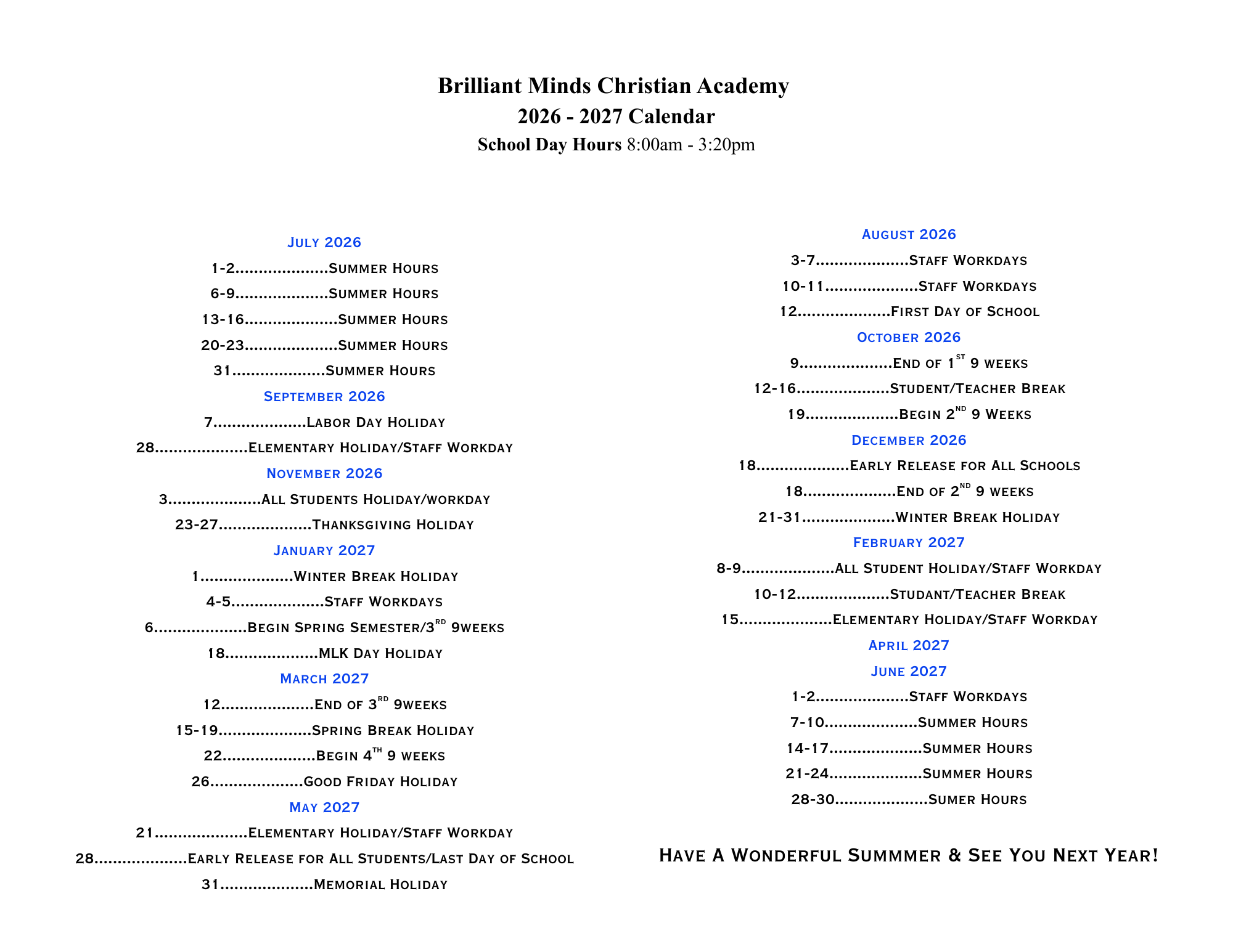 At Brilliant Minds Christian Academy, learning goes beyond the classroom. Students participate in enriching experiences that support academic growth, social development, and spiritual enrichment.